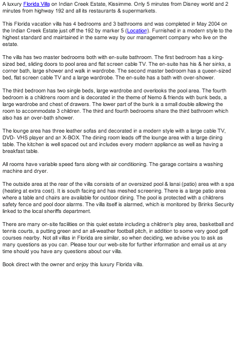 There are many on-site facilities on this quiet estate including a children's play area, basketball and tennis courts, a putting green and an all-weather football pitch, in addition to some very good golf courses nearby. Not all villas in Florida are similar, so when deciding, we advise you to ask as many questions as you can. Please tour our web-site for further information and email us at any time should you have any questions about our villa.
